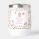 This adorable watercolor Strawberry-themed baby outfit, accompanied by a strawberry hanger, shoes, and baby hat dangling from a vine, serves as a delightful thermal wine tumbler. Set against a backdrop of Strawberry Blossoms pattern forming a heart-shaped arrangement of vines, this design evokes a sense of joy and anticipation. This would make a lovely favour gift for your guest.
