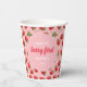 These fun "berry first" birthday paper cups feature a stylish strawberry pattern, red on pink background with contrasting font.