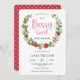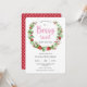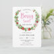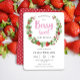 This is a cute gender neutral, baby shower invitation featuring a wreath of strawberries, white flowers and greenery.