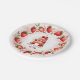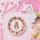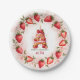 Celebrate in style with this adorable strawberry-themed round paper plate! The elegant border features a circular arrangement of hand-painted strawberries, with a mix of whole and sliced berries, delicate green leaves, and tiny white blossoms. At the centre, a beautifully illustrated letter "A" cake takes the spotlight, decorated with pink frosting, juicy strawberries, and a glowing birthday candle. The soft watercolor background blends seamless shades of blush and rosy pink, creating a festive and charming atmosphere. Perfect for strawberry-themed birthdays, fruit lovers, and summer celebrations. Pair with matching invitations and party decor for a coordinated look!