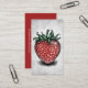 Cute strawberry business card featuring a polka dot strawberry in red, green and white over a mottled grey background.
