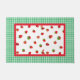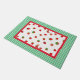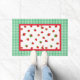 This bright and colourful kitchen rug features a green and white gingham check plaid with a strawberry pattern in the middle. A faux red ribbon borders the strawberry pattern. There is a coordinating oven mit, pot holder, kitchen towel and an apron in our shop too!