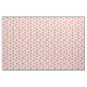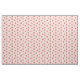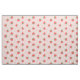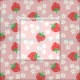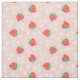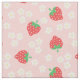 Pink fabric with a pattern of strawberry flowers surrounding strawberries.