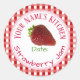 These personalised canning stickers will fit on top of your glass jam, jelly, and preserves jar lids. They have an image of a strawberry with a red chequered border pattern.