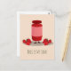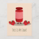 Postcard with a smiling jar of strawberry jam. This cartoon illustration has strawberries on both sides. Below the drawing are the words “This Is My Jam!”. The words can be customised.