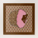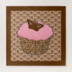 Puzzle of a Strawberry Pink Frosted Cupcake topped with a chocolate butterfly in a decorative, chocolate brown damask patterned cupcake wrapper, on a brown, tan and coral pink Chinese scalloped background