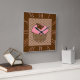 Strawberry Pink Frosted Cupcake topped with a chocolate butterfly in a decorative, chocolate brown damask patterned cupcake wrapper, on a brown, tan and coral pink Chinese scalloped background clock