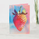 This image is a vibrant, colourful risograph print of a strawberry, featuring a blend of pink, blue, and yellow hues. The artwork has a stylised, almost pop-art aesthetic with dynamic, abstract background elements.