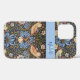 An iPhone 12 pro case with a pattern by the English artist William Morris, called Strawberry Thief. A motif of birds, strawberries and flowers on a blue background. A blue ribbon to monogram with your name.