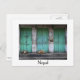 Postcard of stray dogs sleeping on the street in front of old, dirty green doors in Kathmandu, the capital of Nepal with a white border and the text: 'Nepal' .