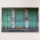 Jigsaw puzzle of stray dogs sleeping on the street in front of old, dirty green doors in Kathmandu, the capital of Nepal.