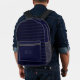 This backpack features a trendy streaky black and royal blue stripe pattern on the front and sides, with a solid dark blue zipper area and a faded triple monogram on the solid dark blue front pocket.