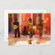 Postcard with an expressive artistic painting of 3 male street musicians performing music on their instruments, which include a mandolin, a flute and a guitar. Rich tones of yellow, orange and brown create a warm timeless magical quality in an impressionist painting style.