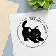 Cute cartoon illustration of a black cat having a good stretch. Customizable text.