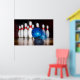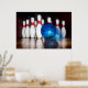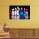 Ten pins about to be crushed by the spinning blue bowling ball entering the one three pocket. Bowling graphic with actual ball and pins. Perfect for the "bowlers" man cave or office.