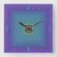 A square wall clock with purple border and green/blue square design .Numerals to match. This simplistic clock is only available in a square shape.