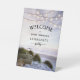 It is sturdy than I expected. Was worried about the material being flimsy but it is not. It is printed on some sort of plastic material. It should serve well at our wedding as long as wind isn’t too bad. Otherwise we will put some paper weights behind it and should be fine.