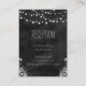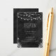 String of Lights Chalkboard © Sunny Mars Designs. Stylish, modern, elegant, classy, trendy, chic customisable formal or cute casual 2.5" x 3.5" wedding reception enclosure cards with a beautiful black chalkboard design featuring bulbs of rope or string lights hanging above with a floral tropical design below.