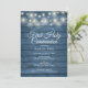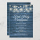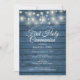 A rustic first holy communion invitation featuring pretty string lights and your special personalised details set in chic typography on a blue wood panels background. Designed by Thisisnotme©