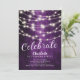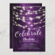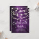 Modern string lights celebrate birthday invitation set on a purple background. View our matching back for an extra special touch.