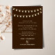 Step into a world of timeless elegance and natural beauty with this elevated rustic wedding invitation. The deep chocolate brown wood background makes the foiled string lights pop, creating a dreamy, enchanting atmosphere for your celebration.