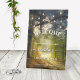 Wedding welcome sign featuring a path in an enchanted forest with festive string lights.