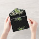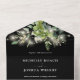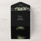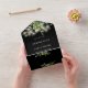 This all-in-one wedding invitation features pretty string lights and botanical greenery falling across elegant typography on a black background. The invitation includes a perforated RSVP card featuring a QR code. Designed by Thisisnotme©