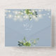 This all-in-one wedding invitation features pretty string lights and botanical greenery falling across elegant typography on a dusty blue background. The invitation includes a perforated RSVP card featuring a QR code. Designed by Thisisnotme©