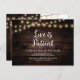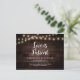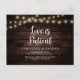 This is the modern minimal clean rustic farm dark wood String Lights design themed, in Black font, Wedding party invitation Rescheduled (postponed / postponement) postcard (Love is Patient) . It is the perfect and elegant way to make the reschedule announcement to your friends and family.