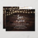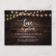 This is the modern minimal clean rustic farm dark wood String Lights design themed, in Black font, Wedding party invitation Rescheduled (postponed / postponement) postcard (Love is Patient) . It is the perfect and elegant way to make the reschedule announcement to your friends and family.