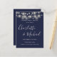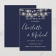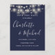 Featuring pretty string lights and signature style names, this elegant navy blue and white save-the-date card can be personalised with your special wedding day details in modern white lettering. Designed by Thisisnotme©