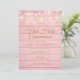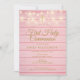 A rustic first holy communion invitation featuring pretty string lights and your special personalised details set in chic gold typography on a pink wood panels background. Designed by Thisisnotme©