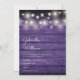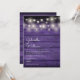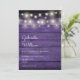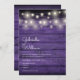 A stylish rustic wedding invitation featuring pretty string lights above the happy couple's names set in an elegant script above the special wedding details on a rustic purple wood background. The reverse features a matching rustic wood background. Designed by Thisisnotme©