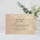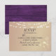 Elegant, country, rustic rose gold and purple wood wedding RSVP card with string lights, gilded gold floral lace and simple calligraphy script.