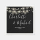 Featuring pretty string lights and signature style names, these elegant black and white napkins can be personalized with your wedding details in chic lettering. Designed by Thisisnotme©