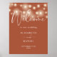 This elegant terracotta wedding welcome sign, featuring pretty string lights, can be personalized with your information in chic typography. Designed by Thisisnotme©