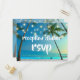 Tropical beach destination wedding reception dinner RSVP postcard features romantic palm trees and string lights. Provides space to include meal choices or prefernces. Easy to customise with your own names and information. Photograph and design by T.K. Goforth, all rights reserved. Be sure to check out matching items in my Tropical Beach and String Lights Wedding Collection in my Zazzle store: