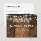 A rustic RSVP card featuring string lights, horseshoes and stylish typography on a barn wood background. The reverse features your details and a fun guest song request. Designed by Thisisnotme©