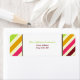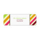 An address label featuring a pink, green, gold, orange, and burgundy striped pattern on each side. Personalise the green and burgundy text at centre with your name and address. Look for matching baby shower invitations at Jill's Paperie.