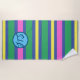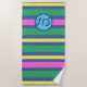 Brilliant pink, green, yellow, and blue stripes fill this colourful beach towel. A dark blue monogram is set off against a bright blue circle.