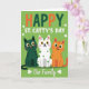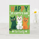 This card features a rich green background that sets a St. Patrick’s Day scene, with three cats lined up side by side like close friends posing for a photo 💚. Above them, the phrase “Happy St. Catty’s Day” sits near the top in orange and deep green lettering, standing out against the green field. The left cat is a dark emerald green with faint stripes and bright yellow eyes, angled slightly toward the others as if keeping them close. In the middle, a white cat with bright green polka dots and warm amber eyes leans into the group, giving the lineup a cozy, together-at-home feel ☘️. On the right, a ginger tabby with classic stripes and green eyes completes the trio, its relaxed expression matching the calm, affectionate mood between them. Small white shamrocks float across the background like confetti, adding motion without crowding the characters. Near the bottom, “Our Family” appears in white, flowing lettering centered beneath the cats, while the shamrocks continue to drift around their paws and tails.