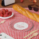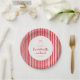 Striped Coquette Bow Bachelorette Weekend Paper Plates. Designed with a red and white striped pattern, bow, and script lettering, personalize these bachelorette paper plates with the bride's name, and wedding or bach weekend location below.