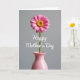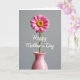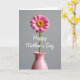 This greeting card features a single pink flower with many slim petals fanning out like a large daisy, circling a golden-yellow center that draws the eye. A thin green stem drops into a blush-pink ceramic vase with smooth curves, giving the scene a gentle, caring feel ❤️. The background is a soft, even gray, and the lighting is calm and diffused, keeping shadows minimal and the mood quiet and affectionate. The flower’s fresh, open face and the vase’s tender pastel tone suggest a warm bond, like a loving glance held a moment longer. The text “Happy Mother’s Day” sits across the mid-area of the design in white lettering, standing out clearly against the gray without covering the flower. The layout leaves plenty of open space around the bloom, letting the colors breathe and keeping the focus on the central arrangement 🌼. The pink petals show faint striped texture, and the vase sits centered near the lower portion of the card.
