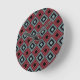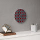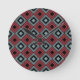 This all clock has an art deco design of diamond shapes with diagonal lines, black diamonds, and coloured diamonds in shades of blue and cranberry.