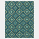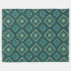 This large fleece blanket has an art deco design of diamond shapes with diagonal lines and coloured diamonds in two shades of teal.