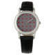 This watch has an art deco design of diamond shapes with diagonal lines, black diamonds, and coloured diamonds in shades of blue and cranberry.