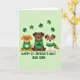 This greeting card shows three cartoon dogs standing close together on a pale green background, their friendly faces turned toward you as if posing for a group photo 💚. The orange-furred dog on the left wears a green sweater with a white shamrock on the chest, leaning in with an easy, buddy-like closeness. In the middle, a brown dog sports a dark green bandana with a shamrock emblem, giving the others a steady, affectionate look that feels like family. On the right, a white-and-light-brown dog wears a green striped sweater, angled slightly toward the center as if sharing the moment with the pair. All three wear oversized green-rimmed rectangular glasses, adding a cute, slightly studious touch that makes them look like best friends ready for a fun day ☘️. Along the bottom edge, the message “HAPPY ST. PATRICK’S DAY! OUR SON” appears in bold sans-serif lettering in dark green, centered and easy to spot. Small shamrocks float above their heads, scattered across the upper area of the soft green backdrop.
