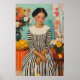 A vibrant, vintage-style painting of a poised woman in a black-and-white striped dress, seated between two colourful floral arrangements and fresh fruits. The scene radiates charm with bold colours, expressive brushstrokes, and a nostalgic, post-impressionist aesthetic reminiscent of Matisse.