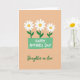This card shows three matching, stylized flowers with bright white petals and golden-yellow centers, standing close together like friends sharing a quiet moment ❤️. Each bloom sits on a slim green stem that rises from a mint-green rectangular planter in the middle of the design. Across the front of that planter, a short celebratory message is placed in simple sans-serif lettering, set in a darker green so it reads clearly. Under the main illustration, a second line of text appears in a flowing calligraphic style, also in deep green, like a soft note tucked beneath the flowers. The background is a muted peach tone with a faint, grainy texture that adds warmth without stealing attention. Gentle greens and sunny yellow accents bring a light, affectionate mood, like a small bouquet offered with an easy smile 🌼. The mint-green planter sits centered on the page, with the two lines of green text stacked neatly beneath the trio of blossoms.