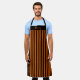 This full-print apron features a striped Halloween orange and black pattern with a solid black section at the top for your personalized name.
